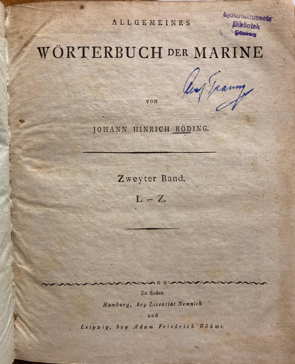 Allgemeines Wörterbuch der Marine. In allen europaeischen Seesprachen nebst vollstaendigen Erklaerungen von Johann Hinrich Röding. Mit Kupfern. Zweyter Band L-Z.