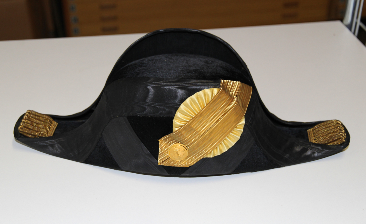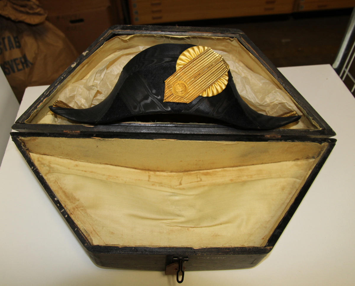 Paradhatt för sjöofficer. Har tillhört Claes Emil Uggla, kapten vid flottan, som tjänstgjorde som konvojofficer under andra världskriget och omkom vid motorfartyget SVEAJARLs förlisning 9 januari 1943.