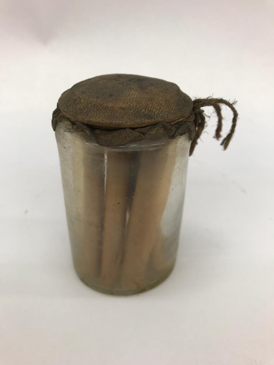 Gummiplåster i mindre förpackningar i glasburk med tygbeklätt trälock. Nr 20 enligt förteckning-