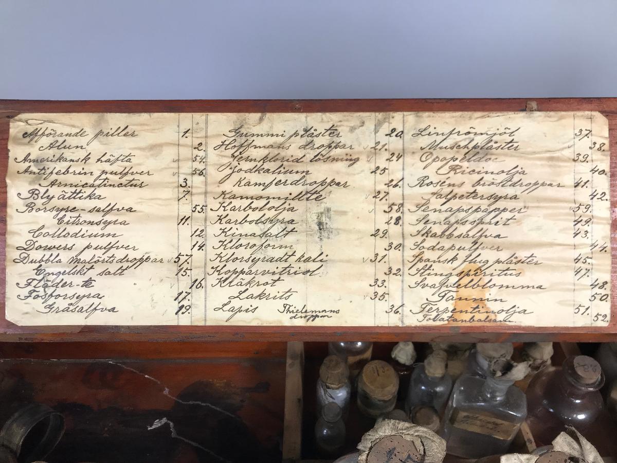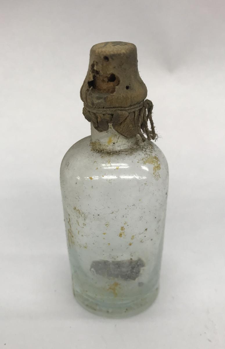 Glasflaska med sämskinnsbeklädd kork med intorkad grå kristalliserad bottensats. korken märkt med nr12, enligt lista Collodium.