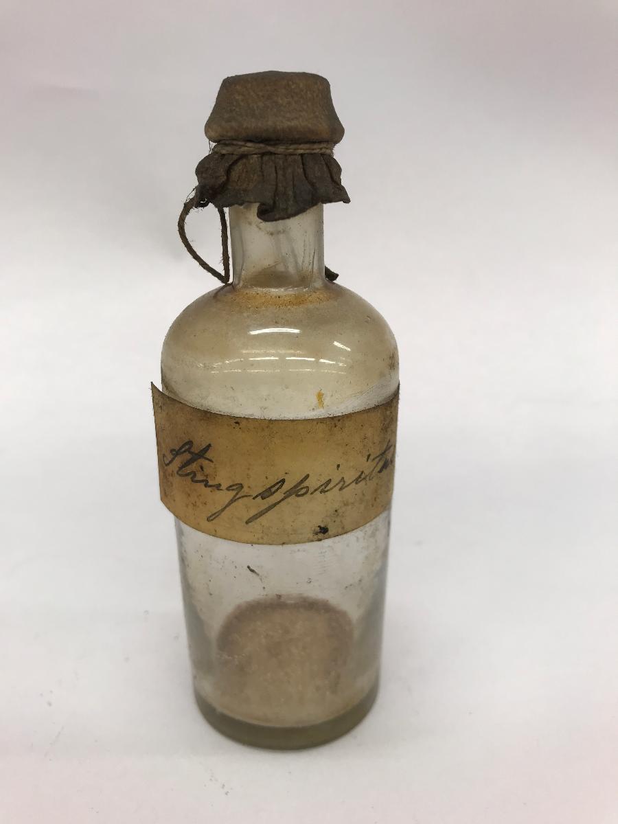 Glasflaska med sämskinnsbeklädd kork med intorkad bottensats. korken märkt med nr47, enligt lista och etikett Stringspiritus.