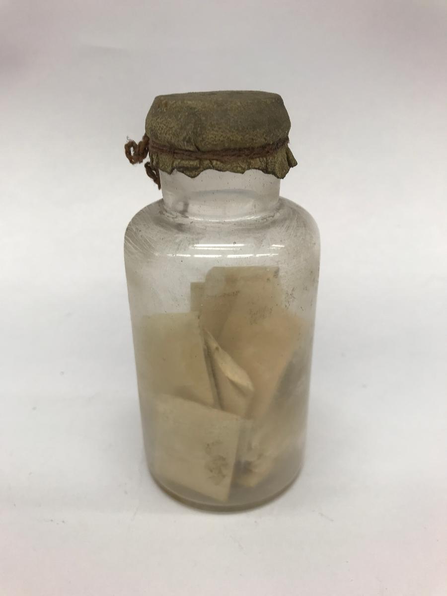 Glasflaska med sämskinnsbeklädd kork innehåller flera små portionsförpackningar. korken märkt med nr33, enligt lista Kräkrot.