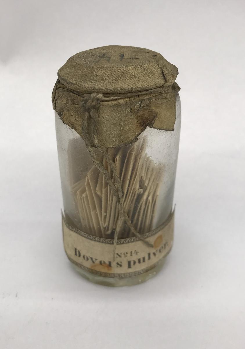 Glasflaska med sämskinnsbeklädd kork innehåller flera små portionsförpackningar. korken märkt med nr14, enligt etikett och lista Dovers pulver.
