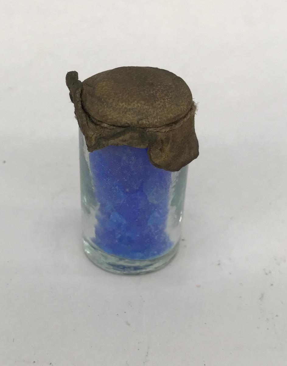 Gå tillbaka till sökLägg till i Min samlingKopiera länkSkriv utMedicinkistaAktörerJohn E. Olson (1849 - 1937), Förvärvat frånKategorimedicinförvaring (Sjukvård och hälsa) Sjukvård och hälsaMaterial och teknikGlasInventarienummerSMG4482, abUtställdInte utställd på museetBeskrivningGlasburk med sämskinnsbeklätt lock, innehåller kristallartat blått pulver. Locket märkt med 32 enligt lista kopparvitriol (Kopparsulfat)