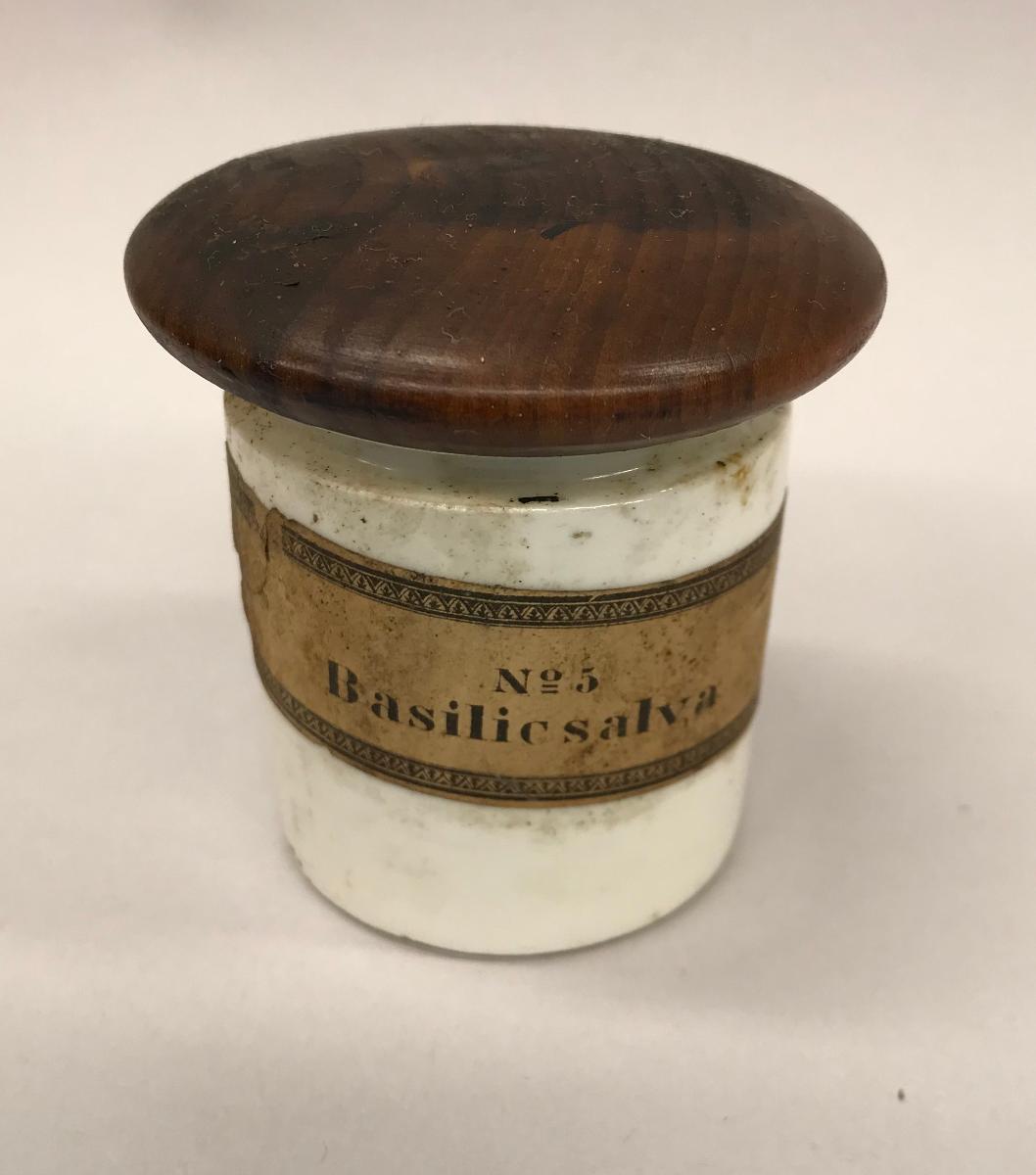 Vit keramikburk med trälock. Brun etikett med svart text Basilicsalva.