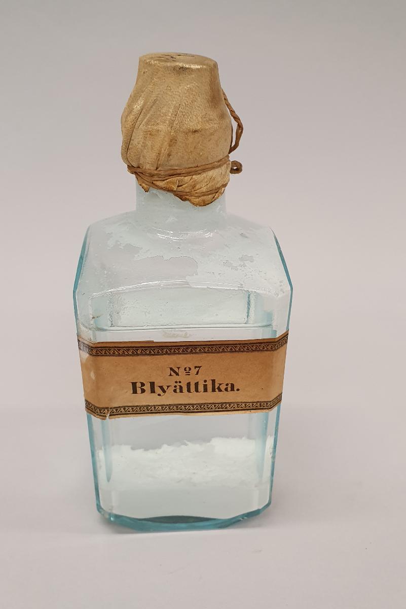 Liten fyrkantig glasflaska med sämskinnsbeklätt lock och snöre ed sigill. Innehåller klar vätska med kristalliserat bottenslam. Brun etikett med svart text No:7 Blyättika.