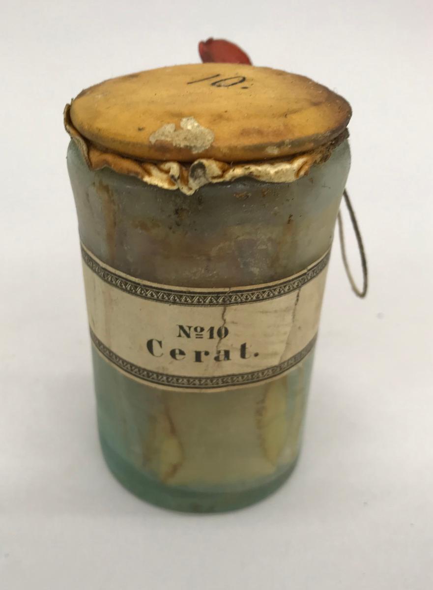 Glasburk med gulbrun salva. Sämskinnsbeklätt lock märkt med 10, tråd med rött sigill. Brun etikett med svart text ; No 10 Cerat.
