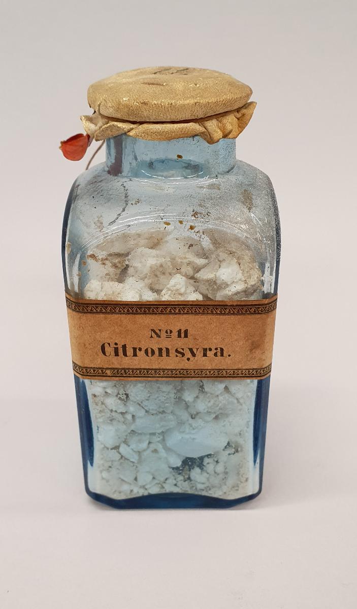 Liten fyrkantig flaska i blått glas, ursprungligen pulver nu helt kristalliserat, vitt. Sämskinnsbeklätt lock märkt med 11, tråd med obrutet rött sigill från apoteket Hjorten. Brun etikett med svart text ; No 11 Citronsyra.