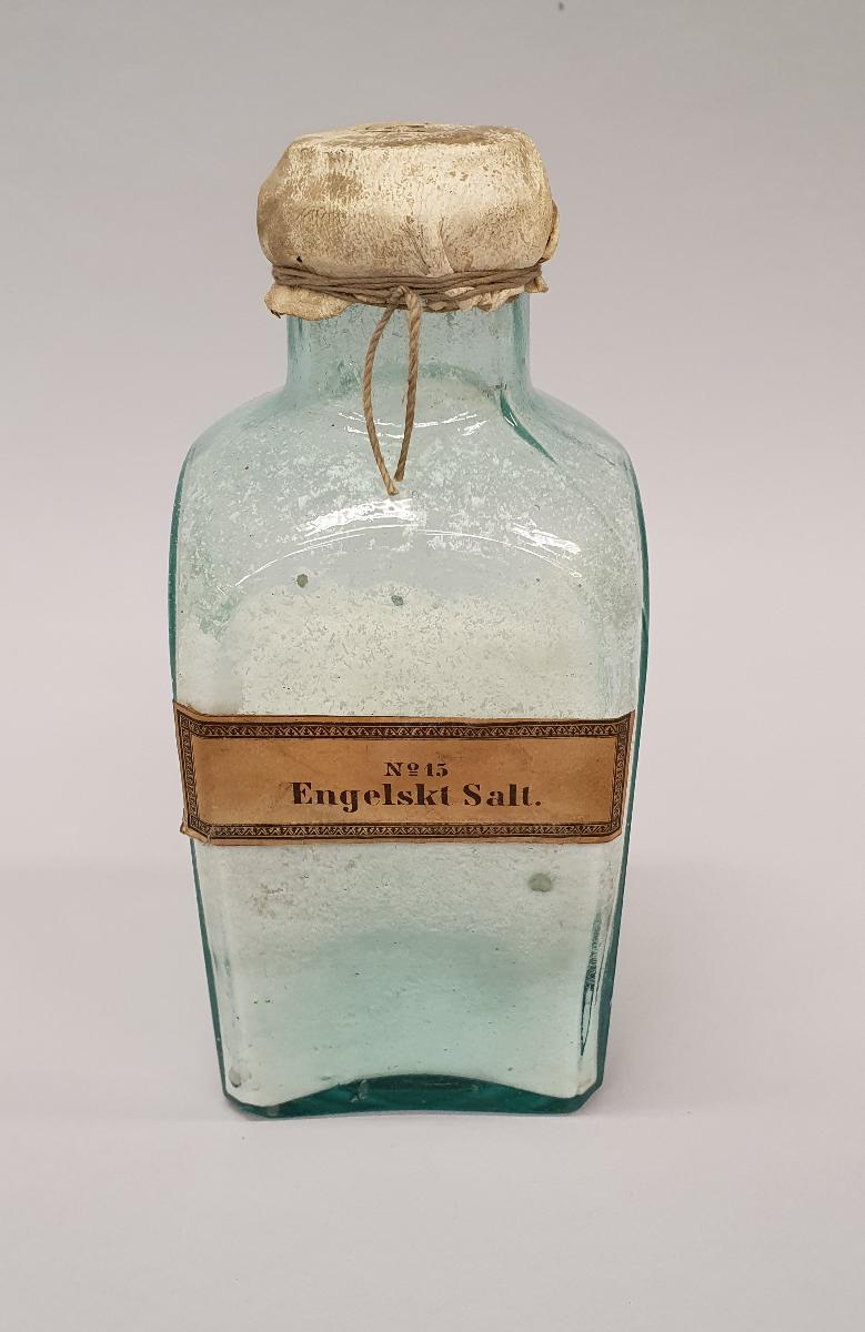Liten fyrkantig flaska i blått glas. Sämskinnsbeklätt lock, tråd men saknar plombering. Brun etikett med svart text ; No 15 Engelskt salt. Innehåller vitt kristalliserat pulver.
