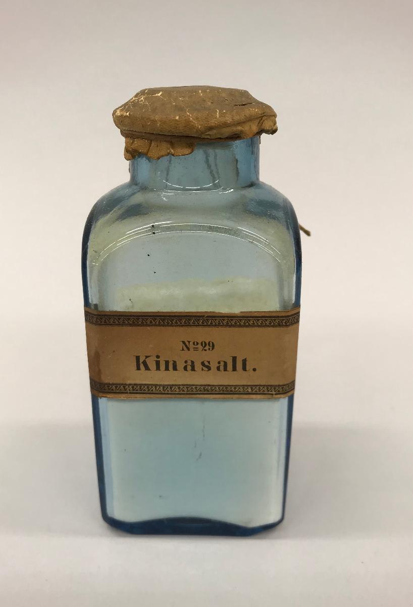Liten fyrkantig ljust blå glasflaska med vitt pulver, försluten med sämskskinn och tråd . Försedd med etikett No: 29 Kinasalt.