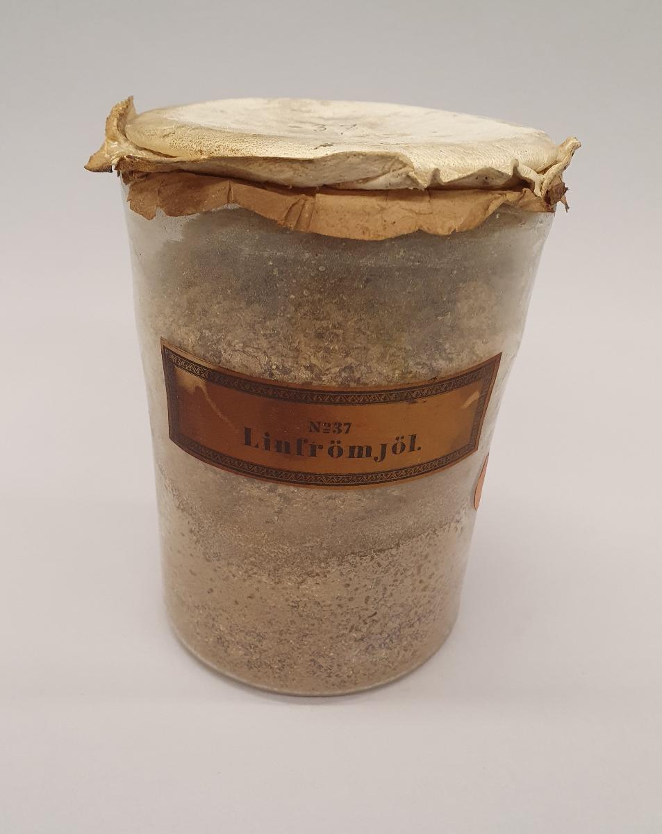 Rund glasburk med tydlig etikett märkt No: 37 Linfrömjöl. Lock av papper och sämskskinn, fastbundet med tråd, Rött lacksigill. Brunt finfördelat mjöl