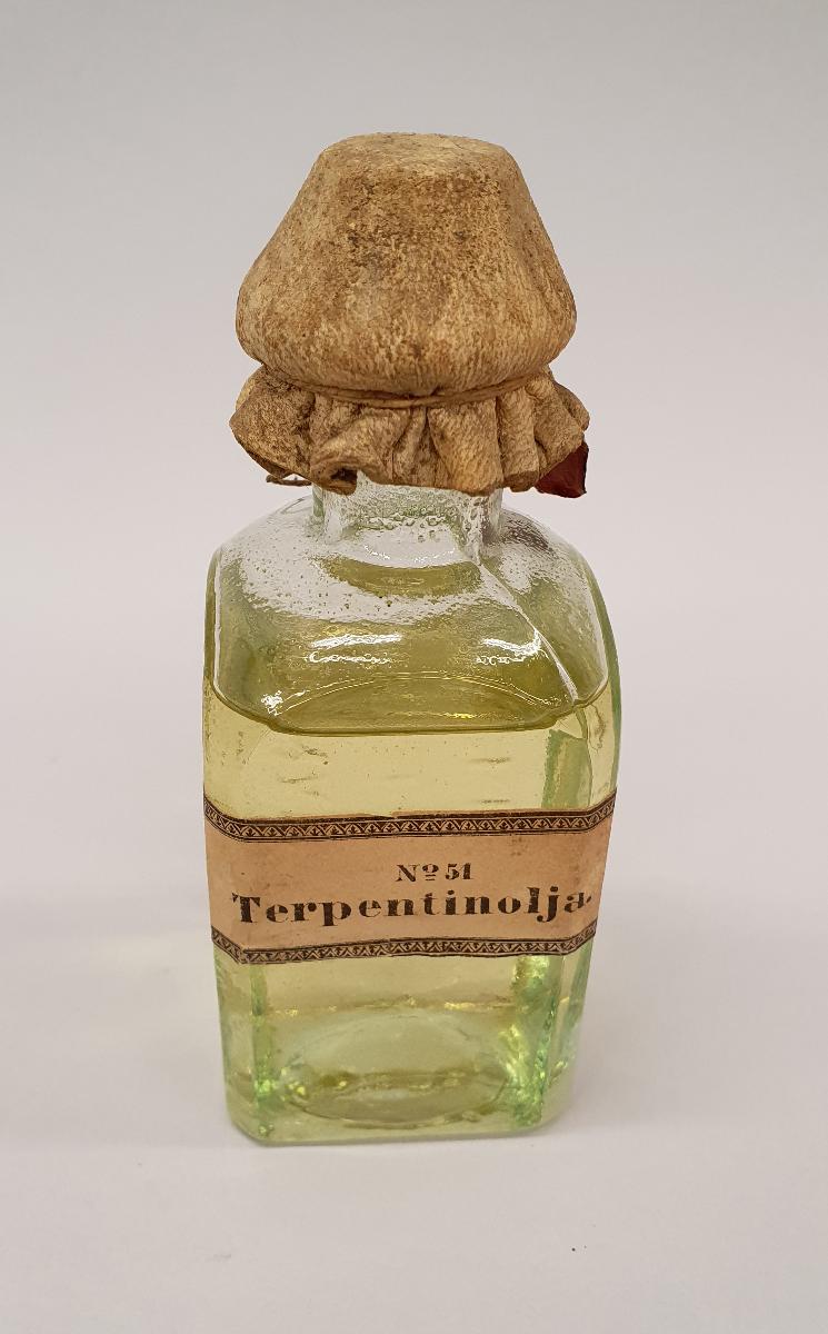 Liten fyrkantig flaska med tydlig etikett märkt No: 51 Terpentinolja , korken omsluten med sämskskinn och snöre plomberat med rött lacksigill från Hjortens apotek. ljust gul vätska.