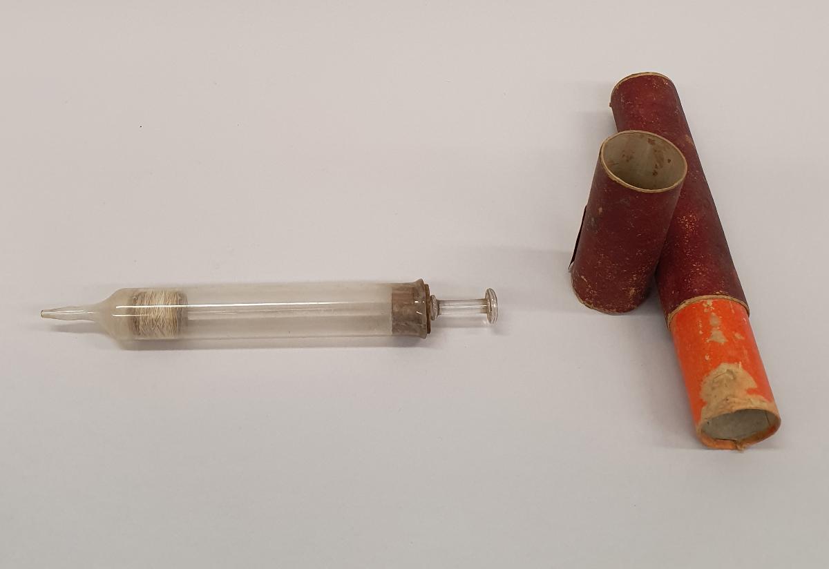 Spruta i glas och kork förvarad i runt fodral av röd papp.