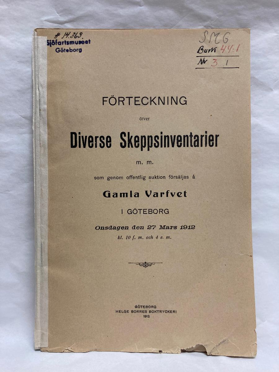 Förteckning över skeppsinventarier vid Gamla varvet, vilka ämnades säljas på auktion 27 mars 1912