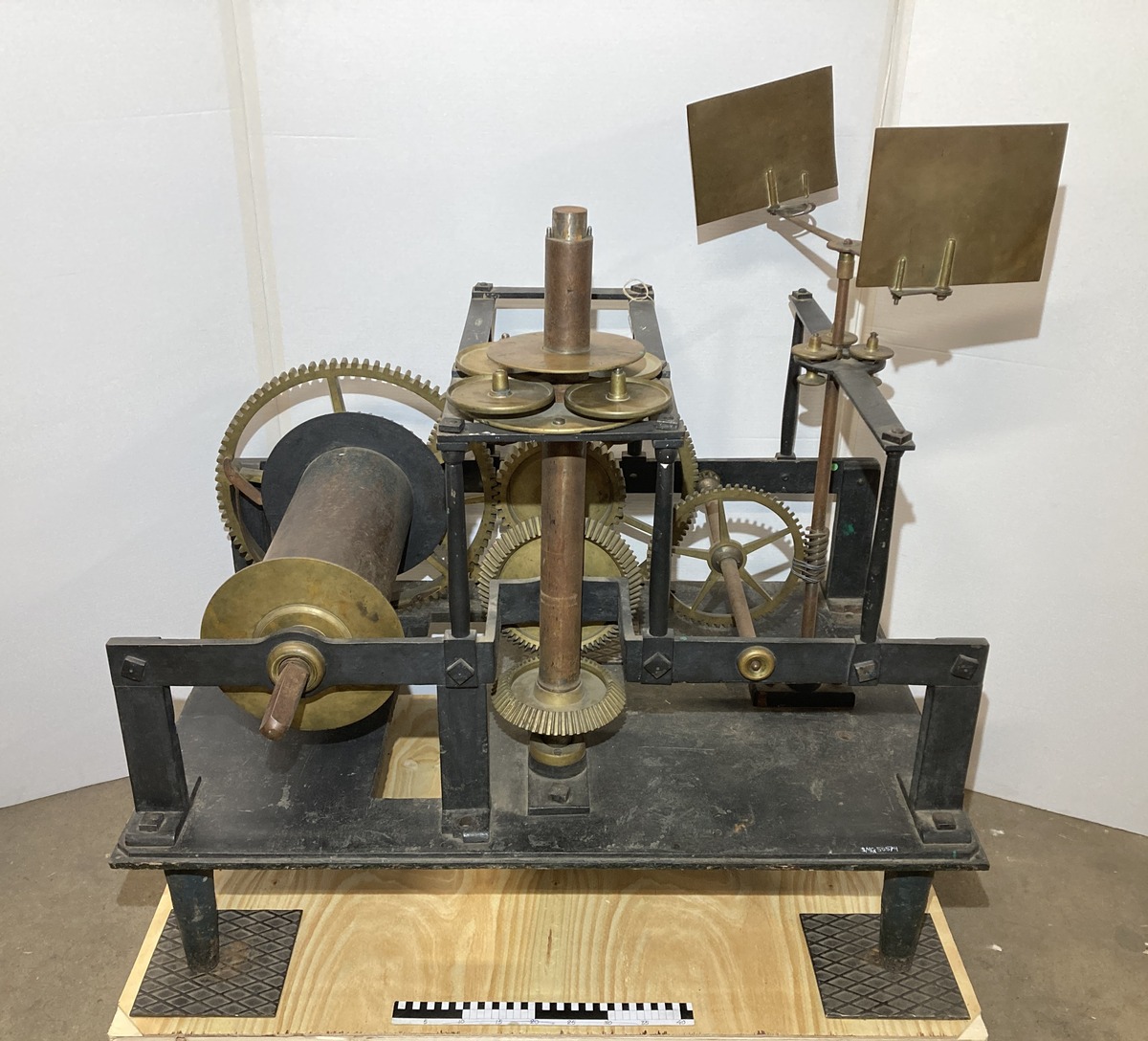 Urverk till omgående (roterande) spegelapparat, med tillhörande glidager för drivaxel. Tillverkad 1839 av Isac Skoglunds i Marstrand. Urverket har varit i bruk vid Söderarms fyr i södra Ålands hav 1839-1928.