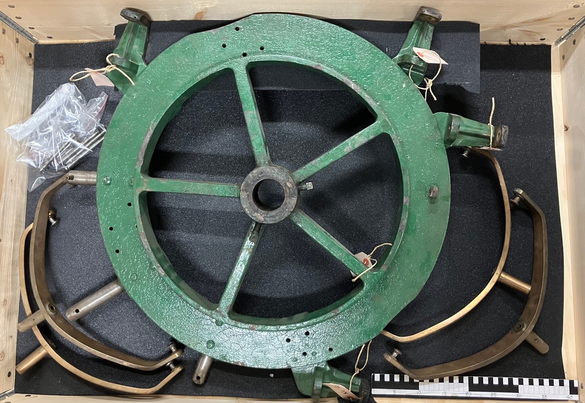 Grönmålat runt stativ av gjutjärn, 4 hållare i mässing.