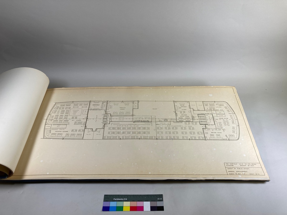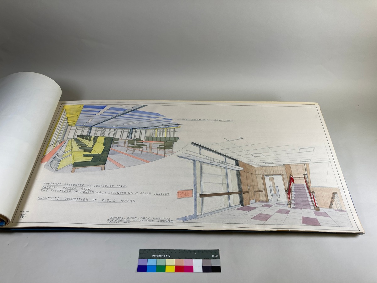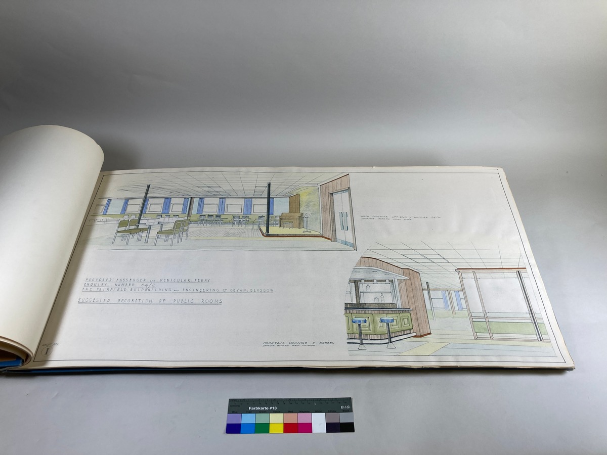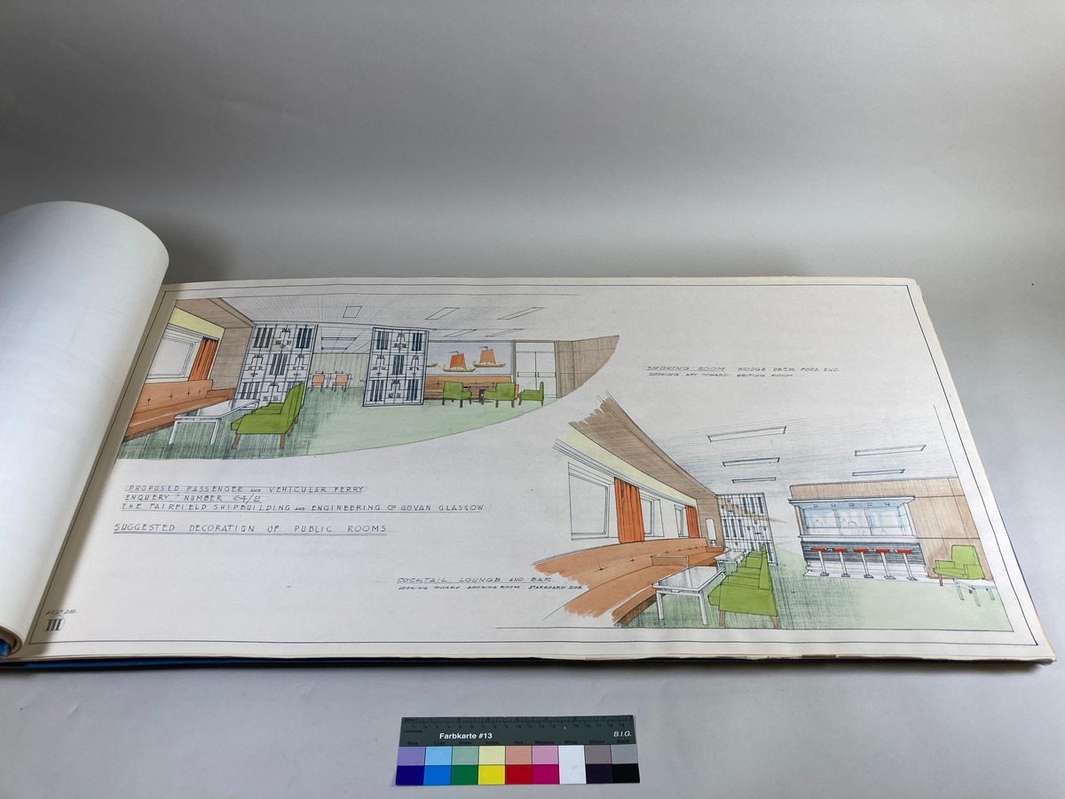Ritningar och färglaggda skisser av ett passagerarfartyg för linjen Hull-Göteborg från varvet The Fairfield Shipbuilding & Engineering Compant Ltd Govan Glasgow.