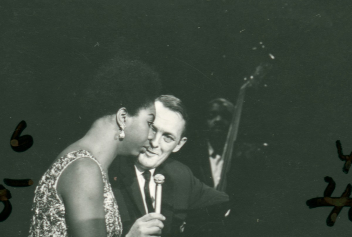 Foto som visar den amerikanska artisten Nina Simone under ett uppträdande på Rondo, Liseberg, i Göteborg. Bredvid artisten sitter en man med mikrofon. I bakgrunden skymtar en man som spelar bas.