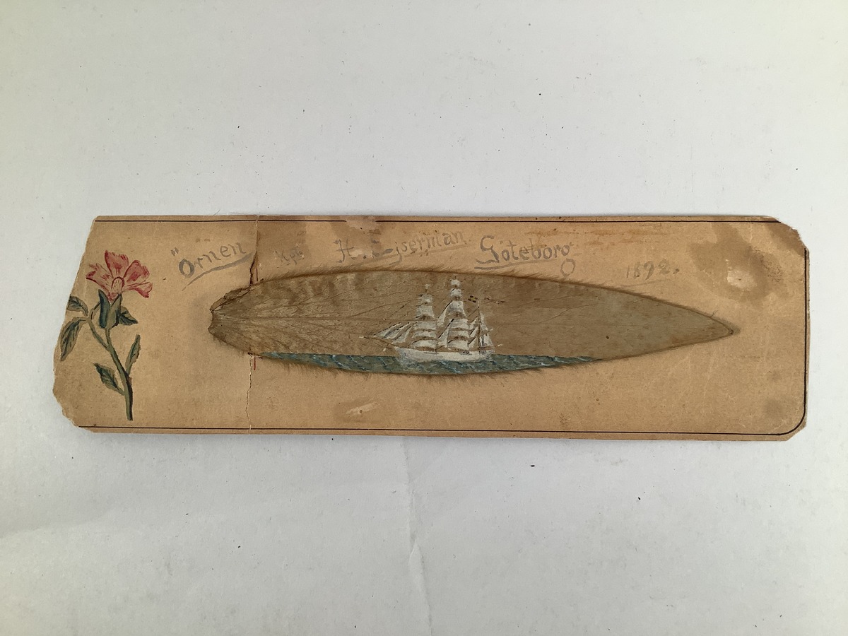 Miniatyrmålning utförd med akvarell på blad från silverträd. Uppklistrat på brunt ark av papper. Dekorerad med rosa nejlika och texten " Örnen Kpt H. Ejserman Göteborg 1892. Troligen utförd i Kapstaden.