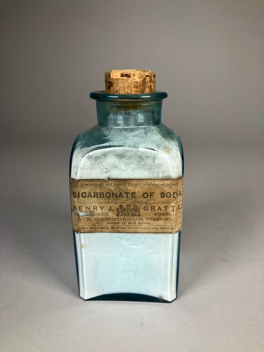 Beskrivning: Ådringsmålad kista i furu med 23 fack för flaskor och burkar, ett större fack i mitten och 22 mindre längst kanterna. Lås med saknad nyckel. Innehåller 21 flaskor varav de flesta är tomma. Utöver dessa finns en rulle bandage i bomull samt en rulle ylleväv 14 cm bred och 260 cm lång. Den senare kraftigt angripen av äldre malangrepp. Ett par öronskydd samt en svart slang med reglage i backelit. En rulle fetvadd i papper har dokumenterats och gallrats.