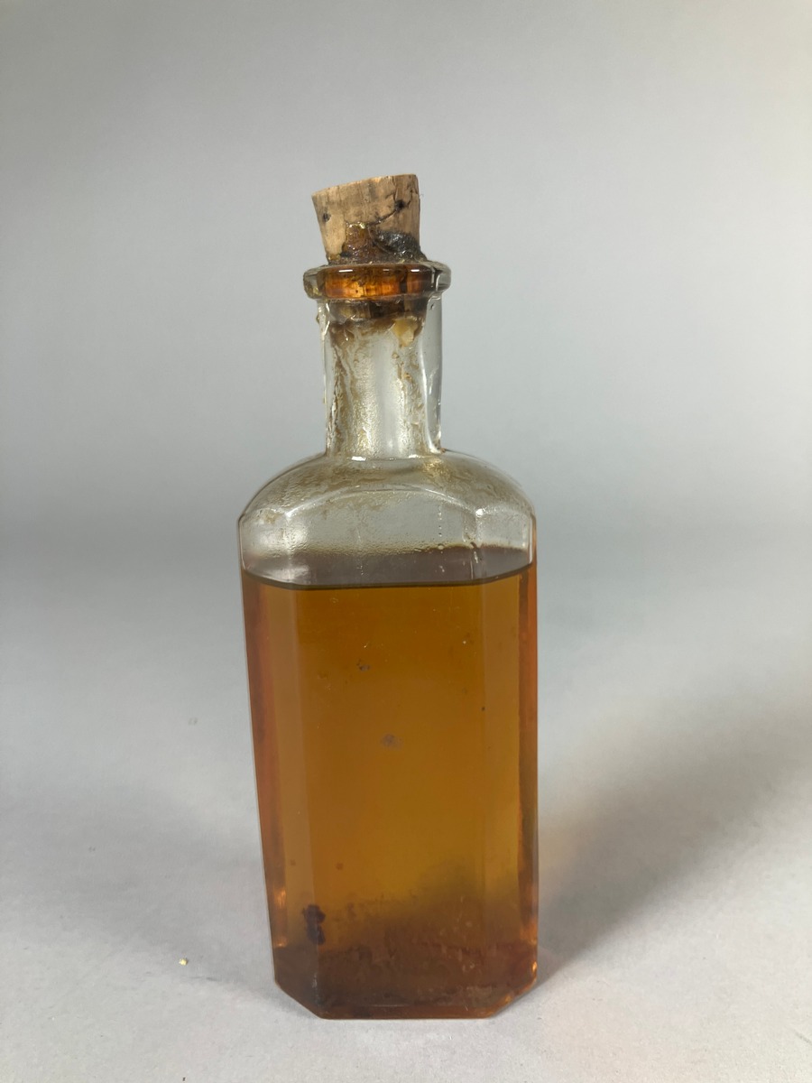 Beskrivning: Ådringsmålad kista i furu med 23 fack för flaskor och burkar, ett större fack i mitten och 22 mindre längst kanterna. Lås med saknad nyckel. Innehåller 21 flaskor varav de flesta är tomma. Utöver dessa finns en rulle bandage i bomull samt en rulle ylleväv 14 cm bred och 260 cm lång. Den senare kraftigt angripen av äldre malangrepp. Ett par öronskydd samt en svart slang med reglage i backelit. En rulle fetvadd i papper har dokumenterats och gallrats.