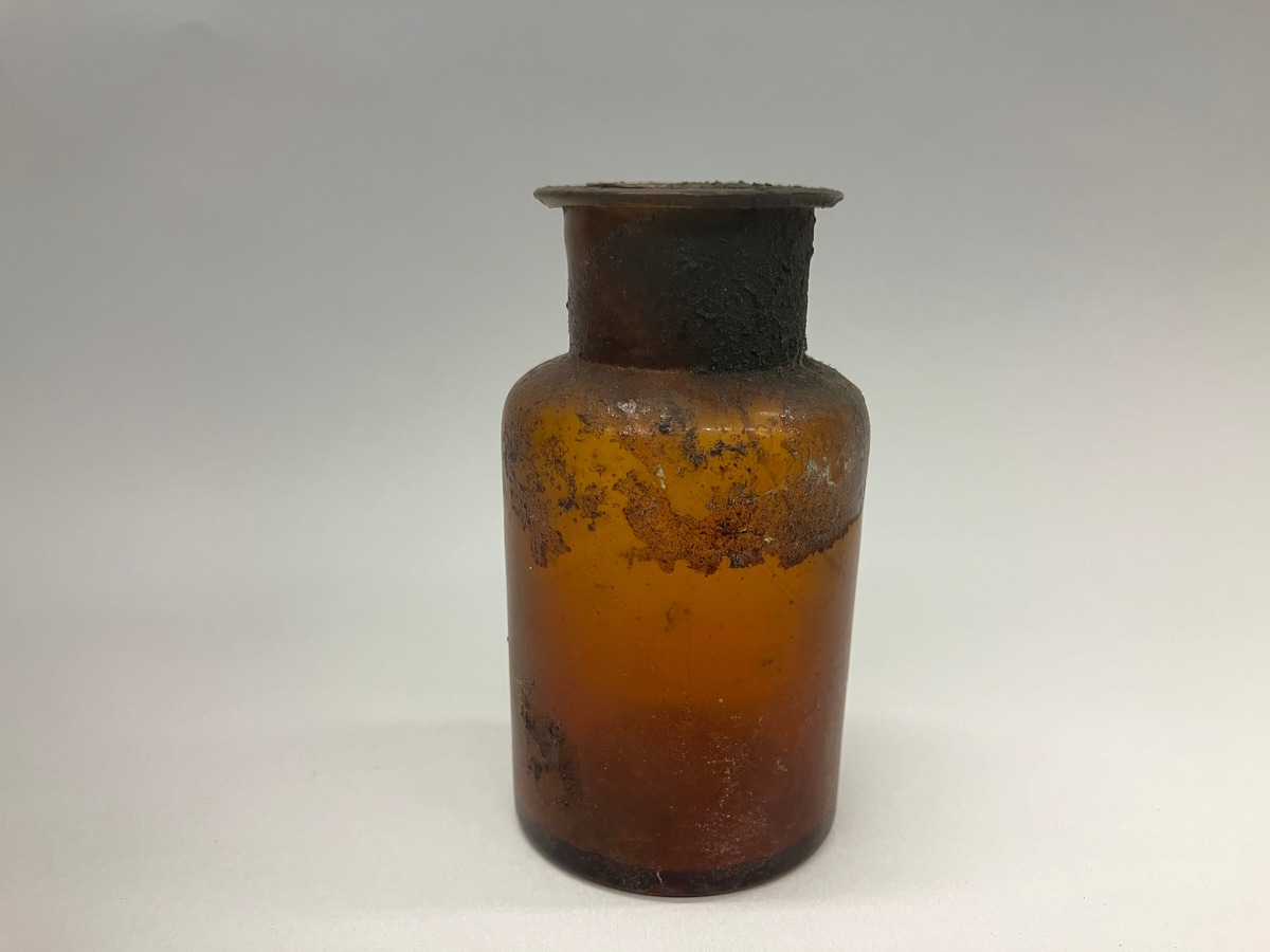 Beskrivning: Ådringsmålad kista i furu med 23 fack för flaskor och burkar, ett större fack i mitten och 22 mindre längst kanterna. Lås med saknad nyckel. Innehåller 21 flaskor varav de flesta är tomma. Utöver dessa finns en rulle bandage i bomull samt en rulle ylleväv 14 cm bred och 260 cm lång. Den senare kraftigt angripen av äldre malangrepp. Ett par öronskydd samt en svart slang med reglage i backelit. En rulle fetvadd i papper har dokumenterats och gallrats.