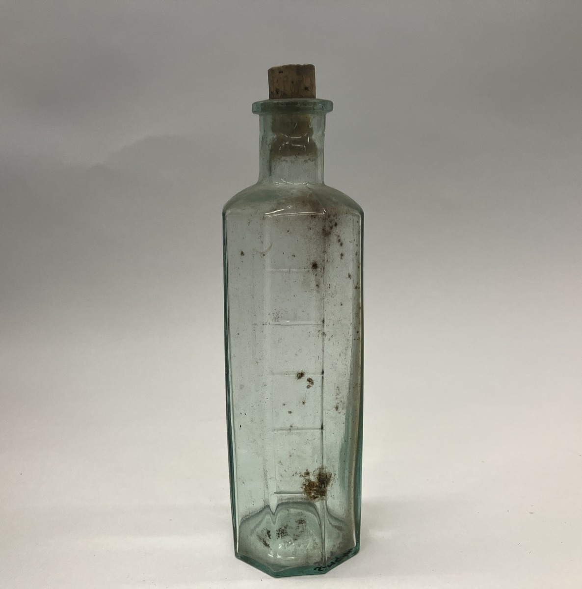 Beskrivning: Ådringsmålad kista i furu med 23 fack för flaskor och burkar, ett större fack i mitten och 22 mindre längst kanterna. Lås med saknad nyckel. Innehåller 21 flaskor varav de flesta är tomma. Utöver dessa finns en rulle bandage i bomull samt en rulle ylleväv 14 cm bred och 260 cm lång. Den senare kraftigt angripen av äldre malangrepp. Ett par öronskydd samt en svart slang med reglage i backelit. En rulle fetvadd i papper har dokumenterats och gallrats.