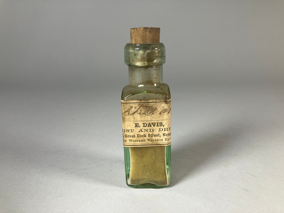 Beskrivning: Ådringsmålad kista i furu med 23 fack för flaskor och burkar, ett större fack i mitten och 22 mindre längst kanterna. Lås med saknad nyckel. Innehåller 21 flaskor varav de flesta är tomma. Utöver dessa finns en rulle bandage i bomull samt en rulle ylleväv 14 cm bred och 260 cm lång. Den senare kraftigt angripen av äldre malangrepp. Ett par öronskydd samt en svart slang med reglage i backelit. En rulle fetvadd i papper har dokumenterats och gallrats.