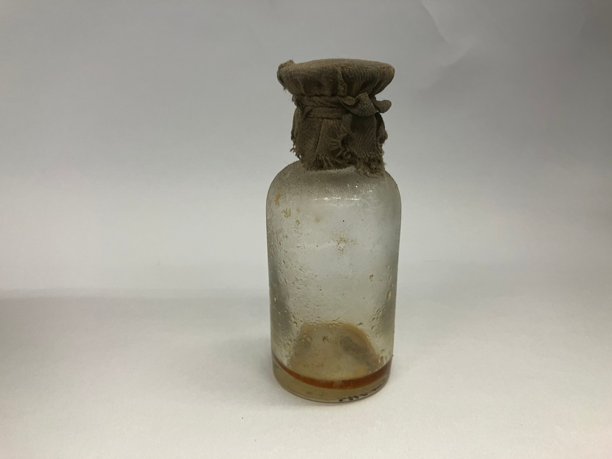 Beskrivning: Ådringsmålad kista i furu med 23 fack för flaskor och burkar, ett större fack i mitten och 22 mindre längst kanterna. Lås med saknad nyckel. Innehåller 21 flaskor varav de flesta är tomma. Utöver dessa finns en rulle bandage i bomull samt en rulle ylleväv 14 cm bred och 260 cm lång. Den senare kraftigt angripen av äldre malangrepp. Ett par öronskydd samt en svart slang med reglage i backelit. En rulle fetvadd i papper har dokumenterats och gallrats.