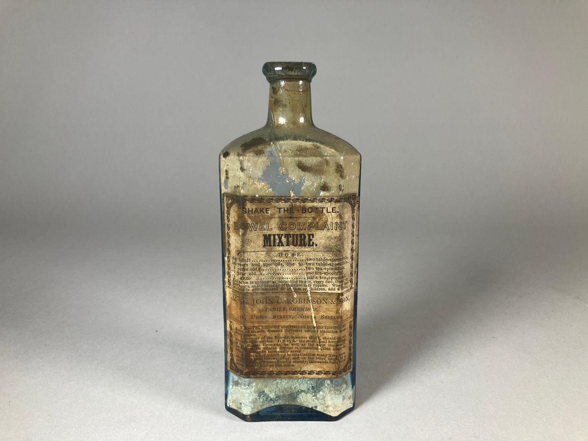 Beskrivning: Ådringsmålad kista i furu med 23 fack för flaskor och burkar, ett större fack i mitten och 22 mindre längst kanterna. Lås med saknad nyckel. Innehåller 21 flaskor varav de flesta är tomma. Utöver dessa finns en rulle bandage i bomull samt en rulle ylleväv 14 cm bred och 260 cm lång. Den senare kraftigt angripen av äldre malangrepp. Ett par öronskydd samt en svart slang med reglage i backelit. En rulle fetvadd i papper har dokumenterats och gallrats.