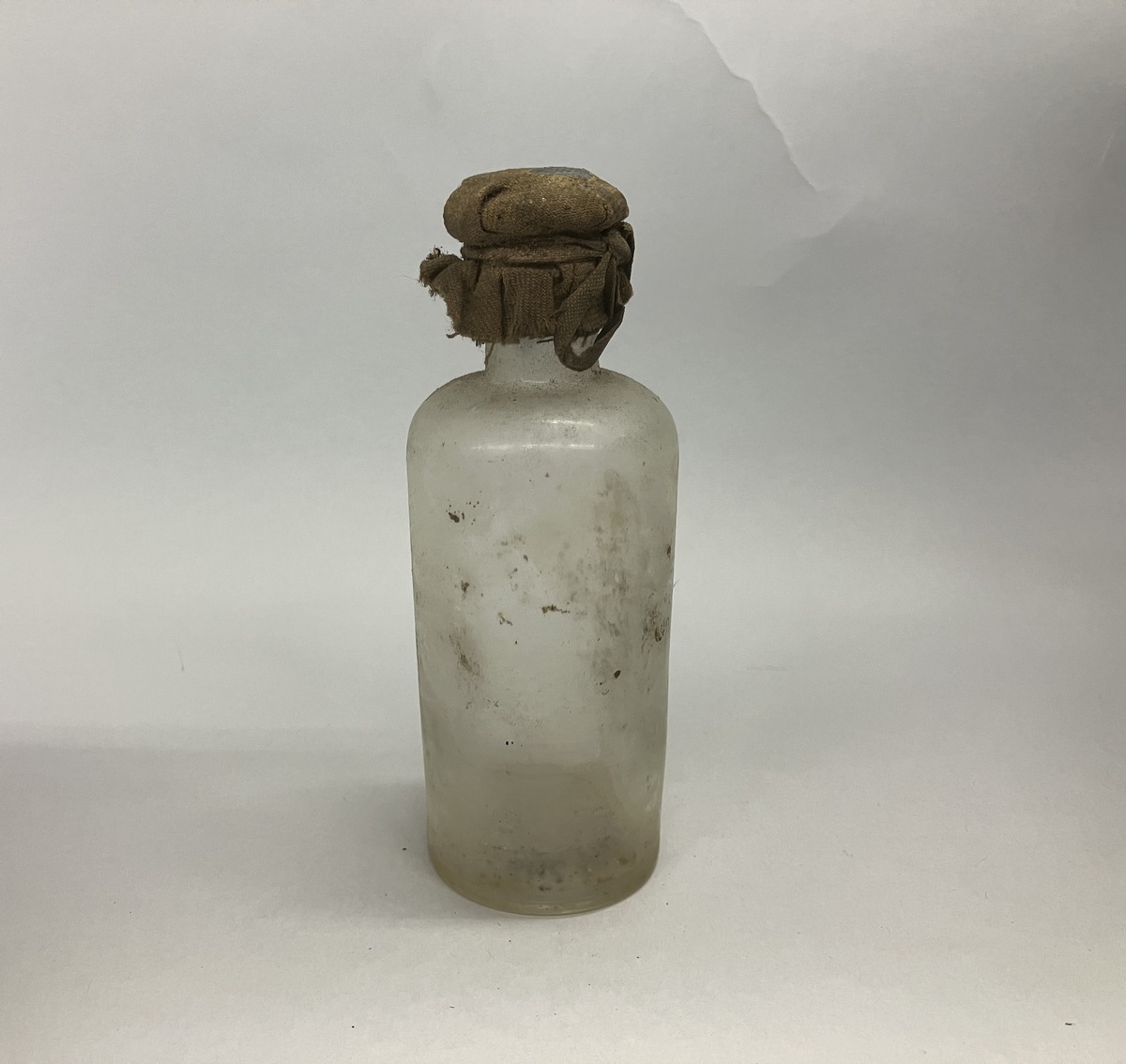 Beskrivning: Ådringsmålad kista i furu med 23 fack för flaskor och burkar, ett större fack i mitten och 22 mindre längst kanterna. Lås med saknad nyckel. Innehåller 21 flaskor varav de flesta är tomma. Utöver dessa finns en rulle bandage i bomull samt en rulle ylleväv 14 cm bred och 260 cm lång. Den senare kraftigt angripen av äldre malangrepp. Ett par öronskydd samt en svart slang med reglage i backelit. En rulle fetvadd i papper har dokumenterats och gallrats.