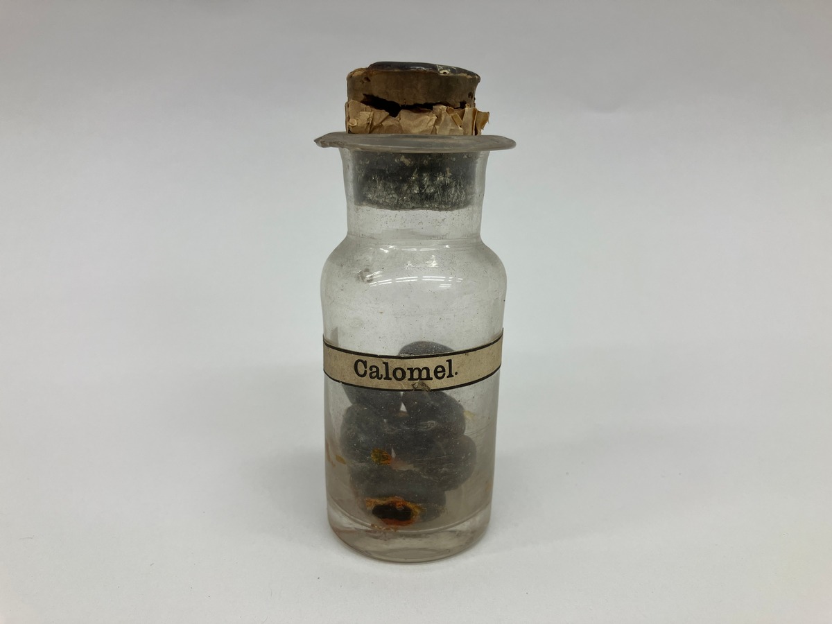 Calomel i tablettform förvarade i liten rund flaska med kork. Calomel är en kvicksilverkloridmineral som användes som medicin från 1500-talet till mitten av 1900-talet trots att det ofta ledde till kvicksilverförgiftning.