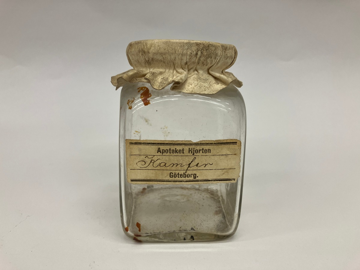 Tom fyrkantig burk med sämskinnsförslutning. Har innehållit Kamfer.