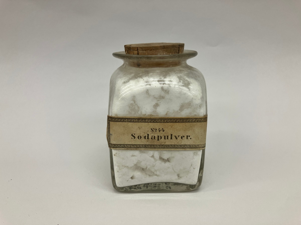 Sodapulver (Natriumbikarbonat) i fyrkantig burk med kork. I den lilla boken Skepps och husapotek av E.G Hallongren från 1872 (SMG9556) anges :