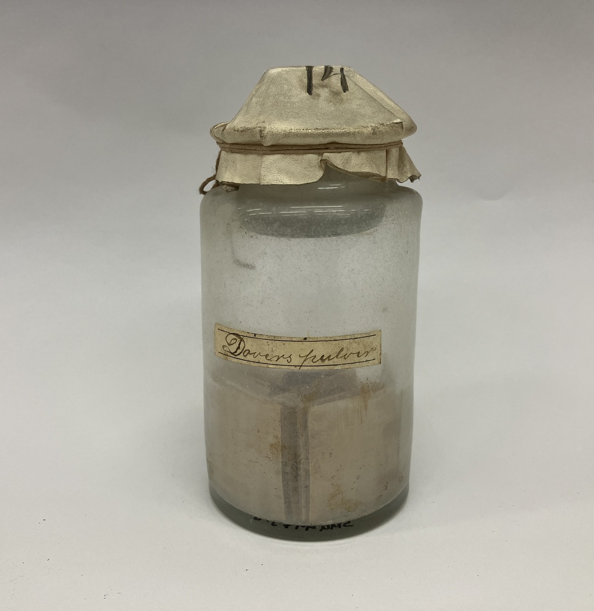 Dovers pulver i portionsförpackningar i rund burk med sämskinnsförslutning. I den lilla boken Skepps och husapotek av E.G Hallongren från 1872 (SMG9556) anges :