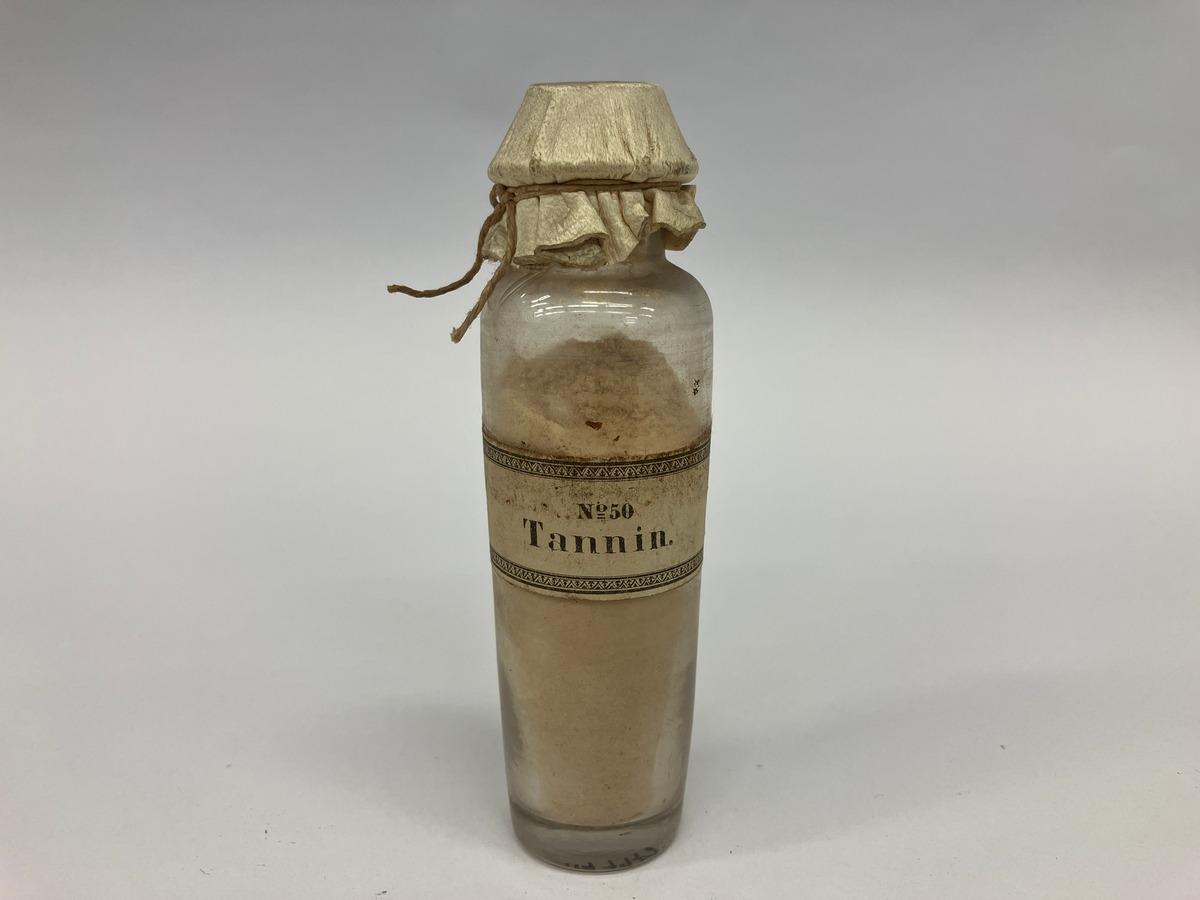 Tannin i rund flaska försluten med sämskskinn.