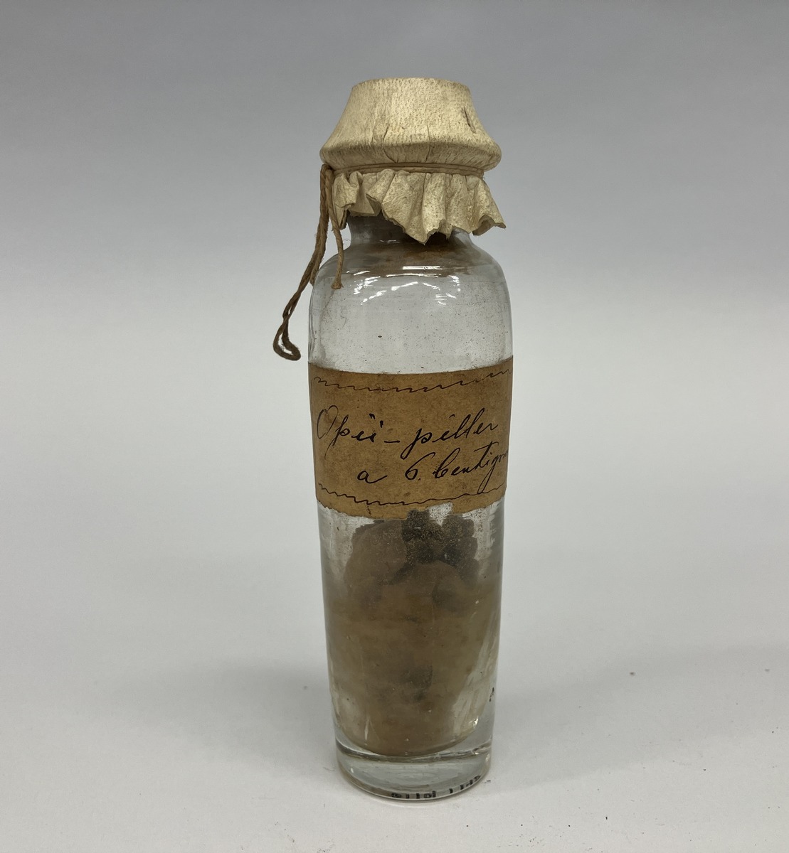 Opii piller i rund glas flaska försluten med sämskskinn.