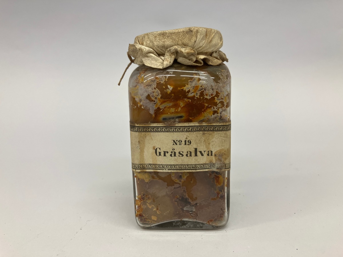 Fyrkantig burk försluten med sämskskinn innehåller gråsalva. Gråsalva var en salva som innehöll ytterst finfördelat kvicksilver blandat med olika fetter. Salvan var känd åtminstone så tidigt som under 800-talet e. Kr. Under lång tid ingick gråsalva i den vedertagna farmakologin (under namnet Unguentum hydrargyri) och användes som ett medel dels mot löss, dels mot syfilis. Ännu i Nordisk Familjeboks s.k. Uggle-upplaga år 1909 presenteras salvan som verkningsfull, utan några varningar för risker vid behandling.
