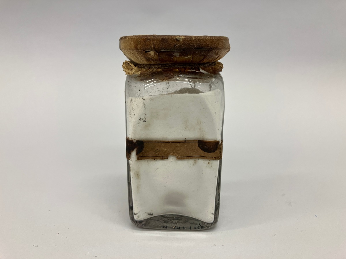 Okänt preparat i fyrkantig burk försluten med sämskskinn. Korken märkt 32