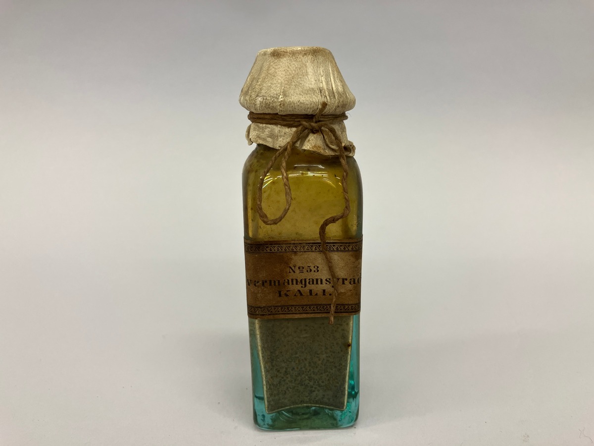 Öfvermangansyrad Kali i fyrkantig glasflaska försluten med sämskskinn.