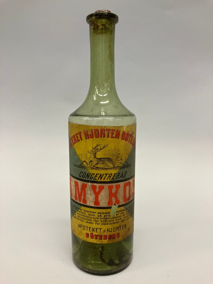 Preparat under namnet AMYKOS i grön glasflaska från Apoteket Hjorten Göteborg. Utförlig beskrivning på flaskans etikett: