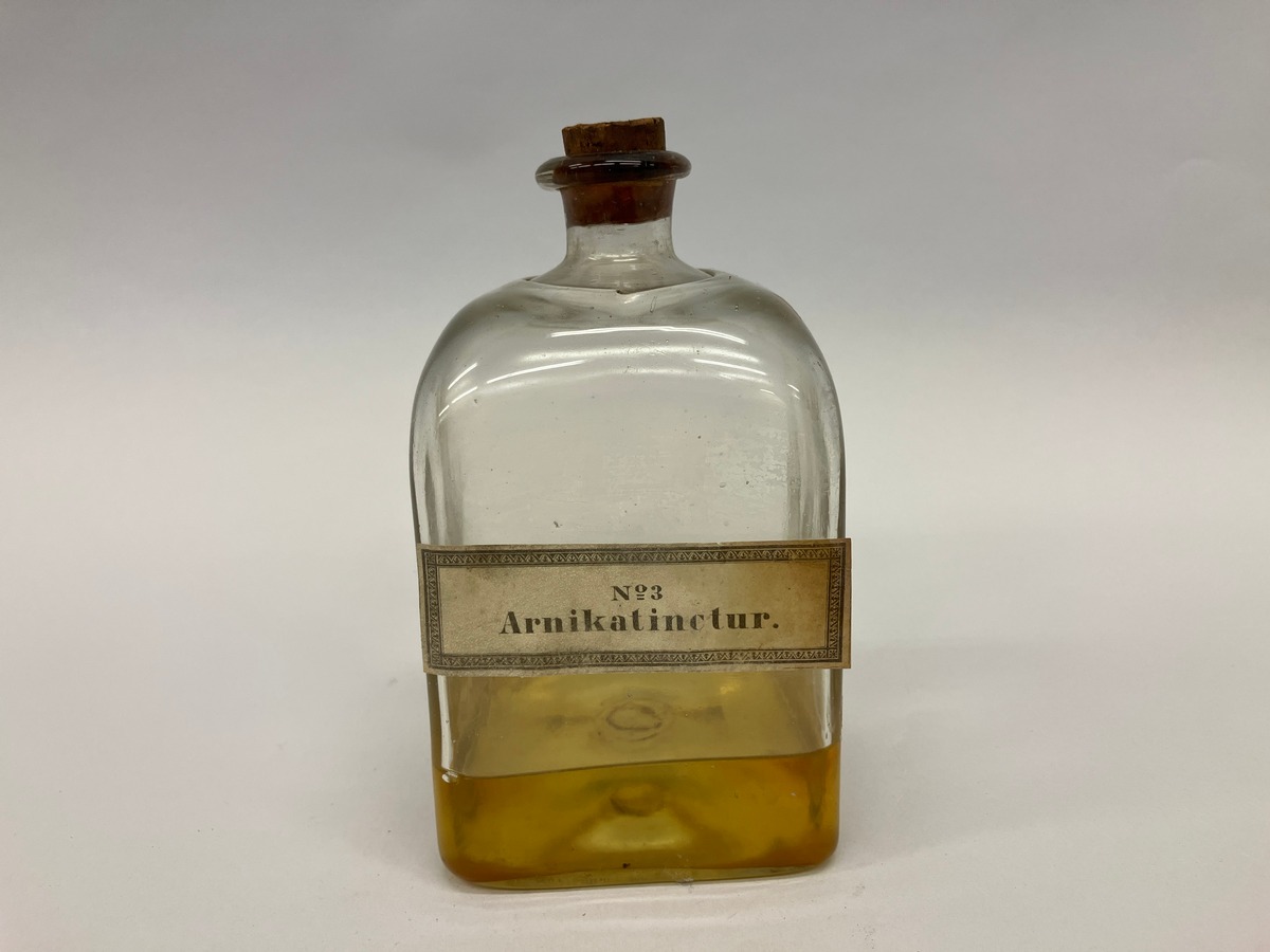 Arnikatinktur i fyrkantig glasflaska. Guldplommon (Arnica Montana) har använts i århundraden som linement för att behandla muskelskador, blåmärken och stukningar.