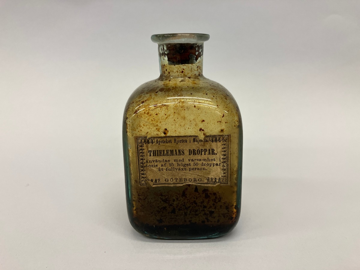 Thielemans droppar i fyrkantig glasflaska försluten med kork.