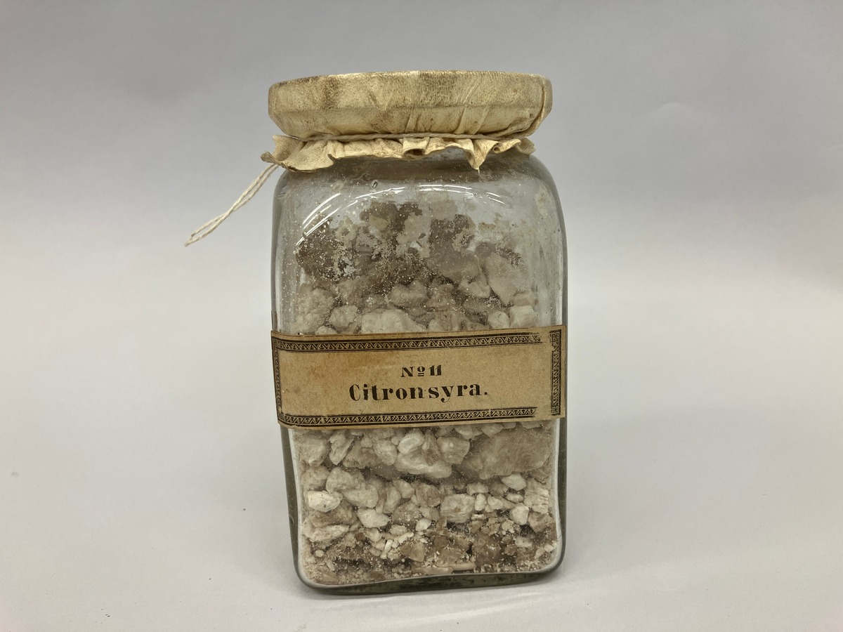 Citronsyra i fyrkantig glasburk försluten med sämskskinn. I den lilla boken Skepps och husapotek av E.G Hallongren från 1872 (SMG9556) anges: