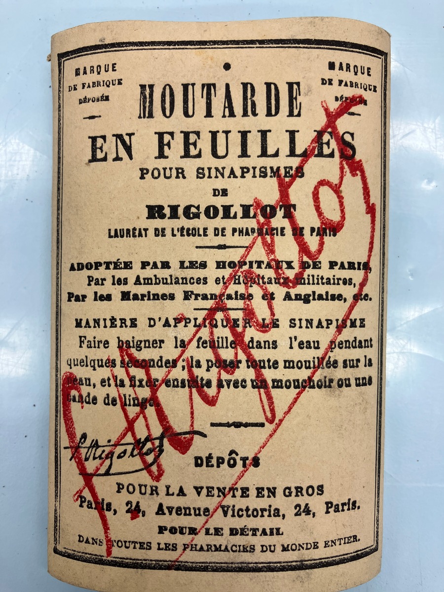 Senapsplåster i papplåda. Moutarde en Feuilles producerade i Paris.