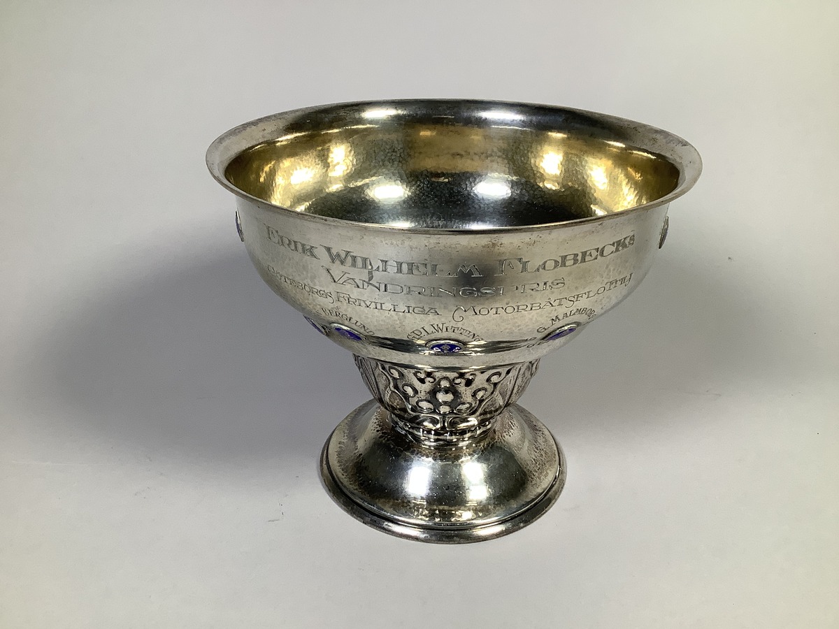 Silverskål på fot, tillverkad av K. Andersson i Stockholm år 1917. Erik Flobecks vandringspris för GFMF