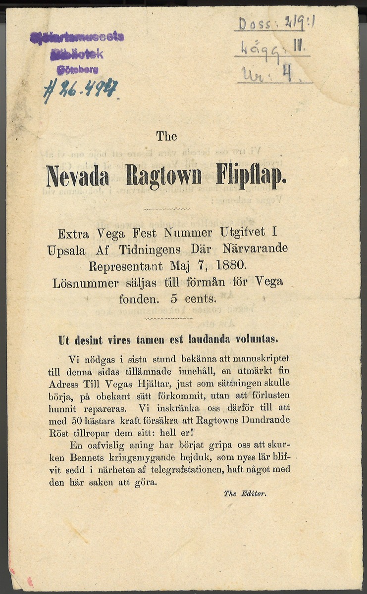 Gå tillbaka till sökLägg till i Min samlingKopiera länkSkriv utFestnummer av Nevada Ragtime FlipflapAktörerAdolf Erik Nordenskiöld (1832 - 1901), Anknytning tillKategoriTidskrift (Litteratur) Vegaexpeditionen (Expeditioner och forskning)DateringTillkomsttid Ca 1880GeografiTillverkningsort: Uppsala (Europa, Sverige, Uppland, Uppsala, Uppsala)Material och teknikPapper, TryckInventarienummerSMG26494UtställdInte utställd på museetBeskrivningFestnummer tillägnat Nordenskiöld och Vegaexpeditionen