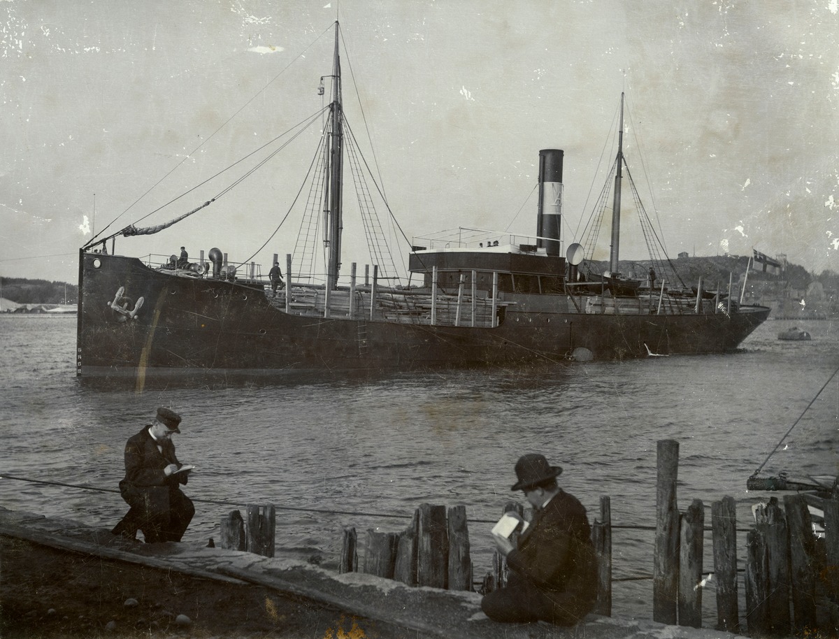 Fartyget är lastat med trä. I förgrunden sitter på personer på kajen. Enligt uppgifter i arkivet är det Hugo Hammar till vänster och Olof Warlin till höger