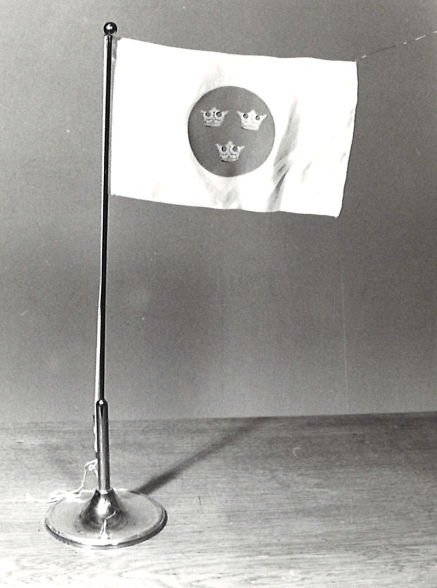 Vit fållad konstfiberduk med ett circelformat blått färgat fält. På fältet tre guldfärgade kronor med röda detaljer.
