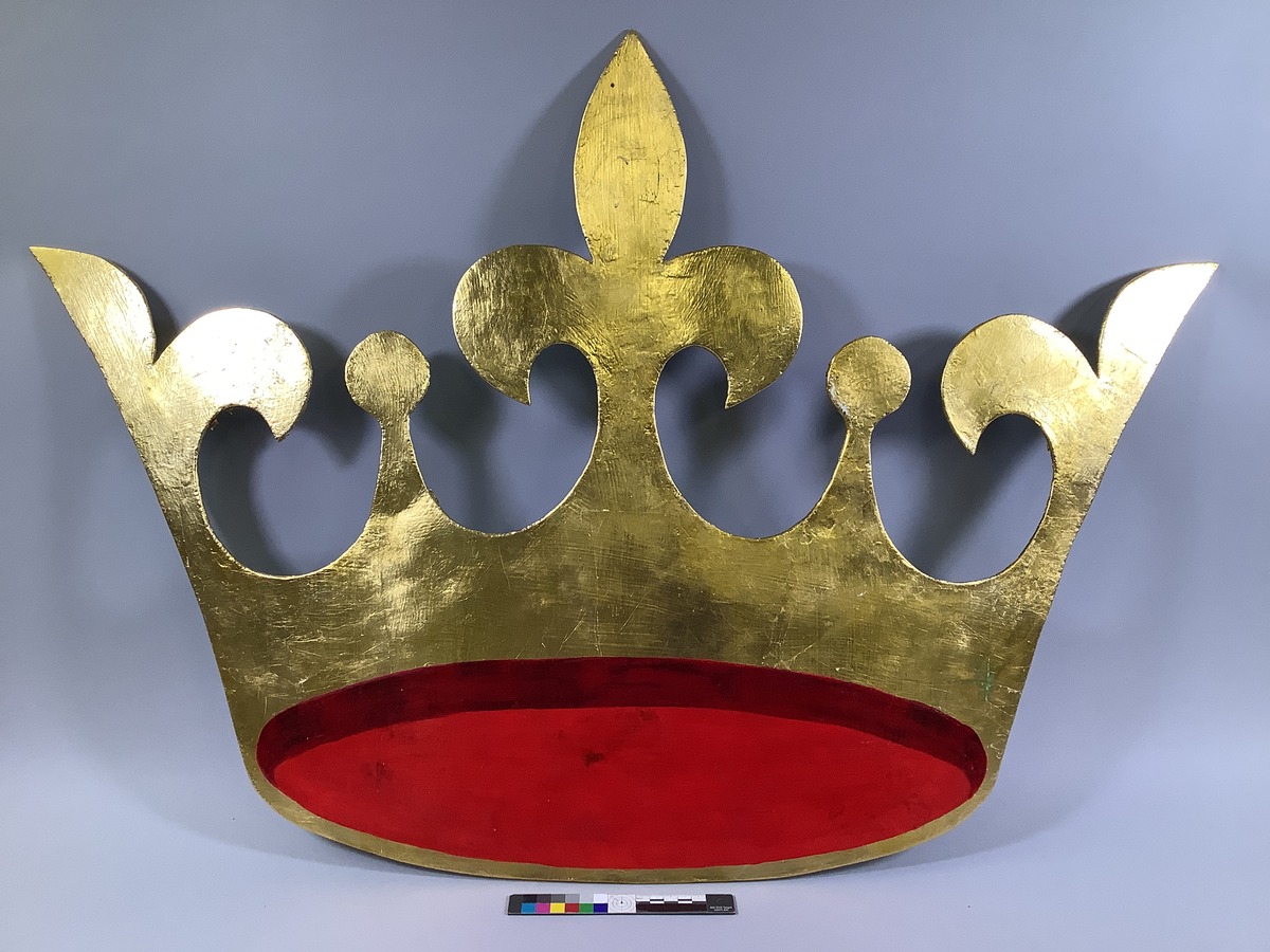 Krona i utskuren i aluminiumplåt med tre större och två mindre spetsar. Kronans framsida är förgylld. I nederdelen är ett öppningshål påmålat med röd färg delvis omgiven av en skuggkant med mörkröd färg.
